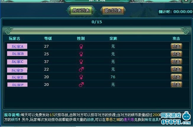 掠奪戰(zhàn)—當(dāng)玩家與玩家角色等級(jí)達(dá)到20級(jí)了,就有一個(gè)互動(dòng)的切磋,勝利者可以獲得的戰(zhàn)績(jī)點(diǎn),失敗者也會(huì)失去戰(zhàn)績(jī)點(diǎn)。在游戲界面的功能表可以看到“掠奪”,有“掠奪列表”與“敵對(duì)列表”兩個(gè)列表框。如下圖