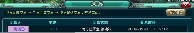 a 當(dāng)玩家A發(fā)出交易給玩家B時(shí),玩家A在交易窗口都可以看到交易狀態(tài)“已發(fā)出 等待對方確認(rèn)”,同時(shí)玩家B的收到玩家A的交易邀請,“交易”功能也會自動閃動,如圖(4)。玩家B打開交易主題,就可以看到對方與自己交易的詳細(xì)信息,然后按”回復(fù)交易”,如圖(5)。玩家A看到覺得交易內(nèi)容無誤,就可以“確定”交易。交易成功!如圖(6)