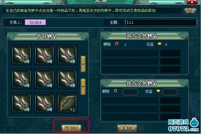 輸入正確的交易人名稱以及主題,并放上相應(yīng)的物品即可開始交易。