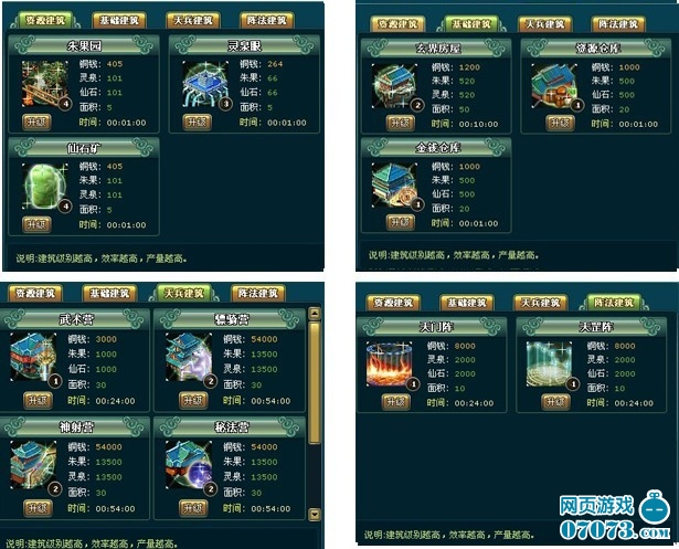提升建筑的基本作用是建筑級(jí)別越高,效率越高,產(chǎn)量也會(huì)更高。在功能表上點(diǎn)擊『玄界』,有一個(gè)『建筑』按鈕,點(diǎn)擊進(jìn)去可以發(fā)現(xiàn)如圖(1)所示,建筑可以分為四大類:1.資源建筑 2.基礎(chǔ)建筑 3.天兵建筑 4.陣法建筑。其每一類建筑都有不同,如圖(2)可以看到升級(jí)是需要資源條件與時(shí)間符合。如下