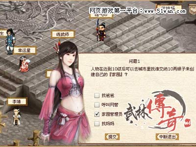 在《武林傳奇》科舉系統(tǒng)中,玩家每天可以參加一次“科舉”考試,大家可以在游戲中杭州城內(nèi)找武技場的“問答百曉生”參加,“科舉”考試中共五題,全部答對將隨機(jī)獲得金豆、武林盟主令、以及有一定幾率獲得終極秘籍等等。