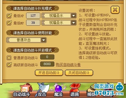 雙擊使用自動戰(zhàn)斗卷之后即可獲得“自動戰(zhàn)斗次數(shù)”,元寶版自動戰(zhàn)斗可以額外獲得1.2倍經驗。在游戲界面右下角【人物】按鈕點開之后可以查看到掛機次數(shù):進入野外戰(zhàn)斗場景,在戰(zhàn)斗界面中點擊“自動戰(zhàn)斗”,打開自動戰(zhàn)斗設置面板,如下: