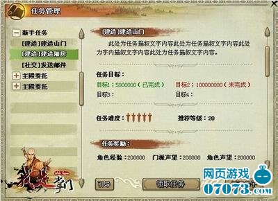 當(dāng)玩家有了屬于自己的弟子之后,就可以去接任務(wù)了,在任務(wù)管理界面包含了任務(wù)描述、任務(wù)目標(biāo)、任務(wù)難度、推薦等級(jí)和任務(wù)獎(jiǎng)勵(lì)這些內(nèi)容,玩家可以領(lǐng)取任務(wù)后派遣弟子去執(zhí)行任務(wù)。