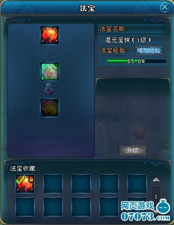 法寶可以通過每次使用法寶技能來積累法寶經(jīng)驗,當經(jīng)驗值達到一定程度時,玩可以在法寶升級界面中點擊"升級"按鈕將法寶升級。