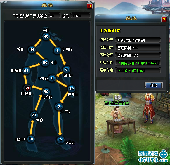 提升經(jīng)脈的條件包括“打通經(jīng)脈”等級(jí)以及修為值。“打通經(jīng)脈”等級(jí)在天賦內(nèi)進(jìn)行提升,修為值可通過(guò)歷練等方式獲得。以下為各個(gè)經(jīng)脈的效果: